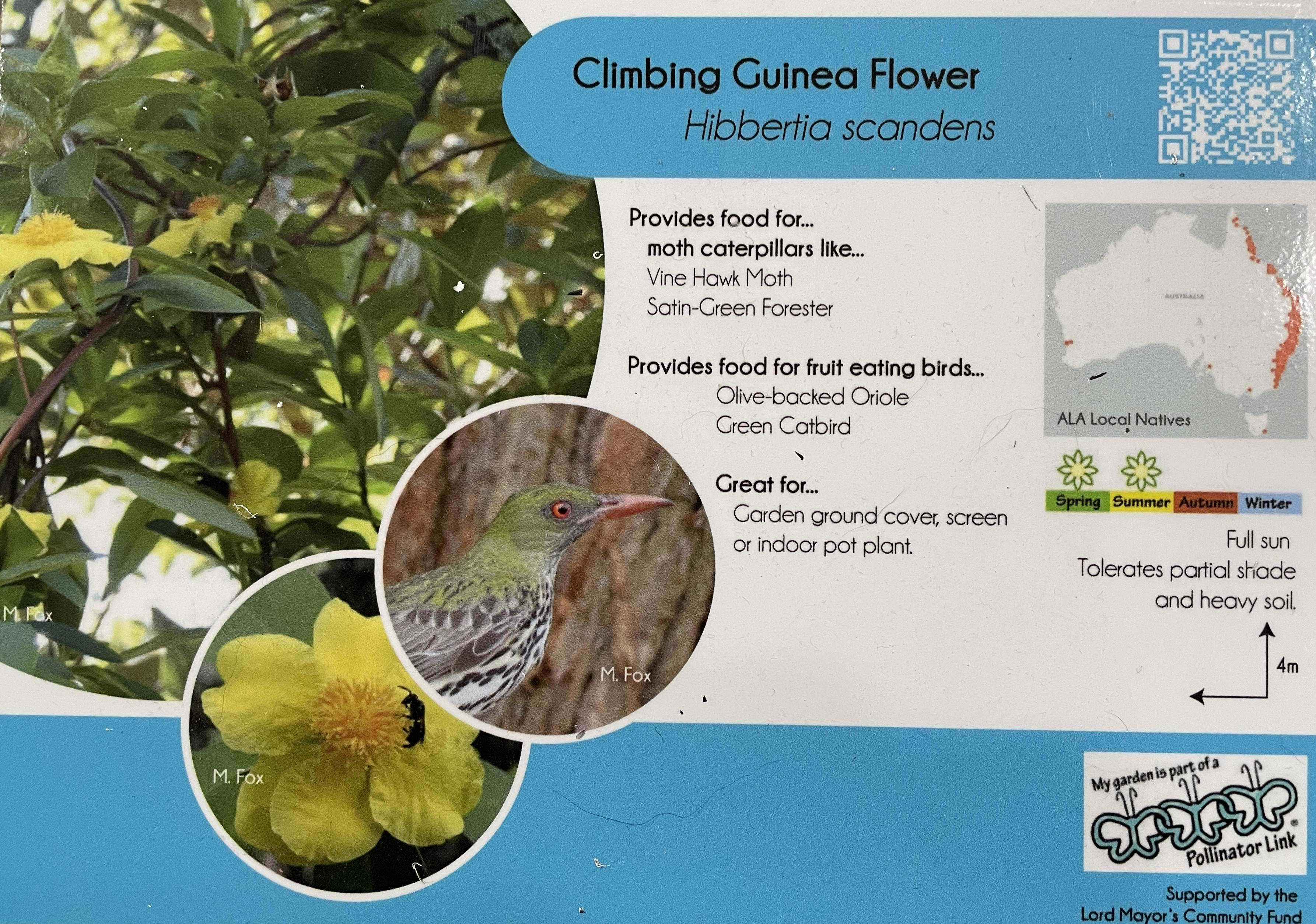 We have started placing our new plant information signs that show people not only what the plants look like but also what butterflies, bee, etc are attracted. Also included is information on use as bush food, where the plant occur naturally and when they flower. The objective is to have plants flowering all year to attract insects as food for insect eating birds.
