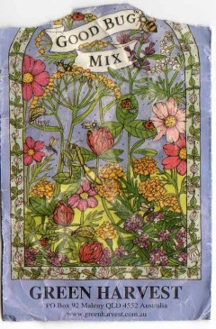 Planting Green Harvest’s Good Bug Mix is an interesting experiment in providing food for a range of beneficial insects such as Hoverflies the larva of which eat aphids off roses.