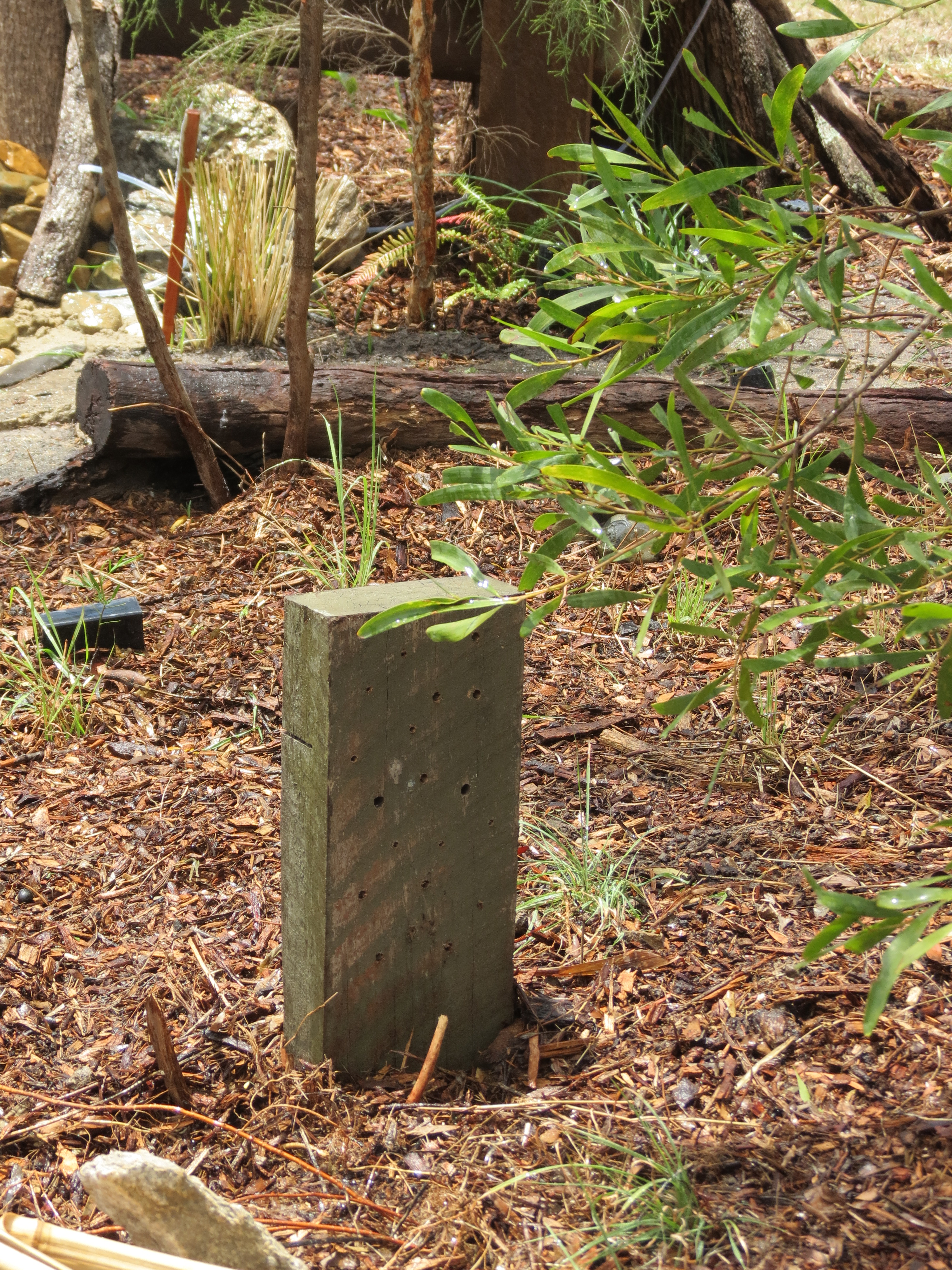 The clumping nature of grass provides safe habitat for lizards. Adding a backyard bee home will create breeding places for native Leafcutter and Resin bees. Australia has more than 1,500 native bee species but they are not commonly known. Only a small number of native bees like the Singless Sugar Bag bees, Trigona carbonaria, are social bees living in a hive. The vast majority of our native bees are solitary. The female Leafcutter bee cuts neat 20c sized pieces out of rose leaves. Rolling the cut leaf between her legs she flies off to find a suitable hole to make a cigar shaped nest to load with pollen before laying her eggs. Drilling a number of holes, ranging between 5 and 10mm diameter, in an off cut of landscaping sleeper created a bee home for native bees in the grass habitat.