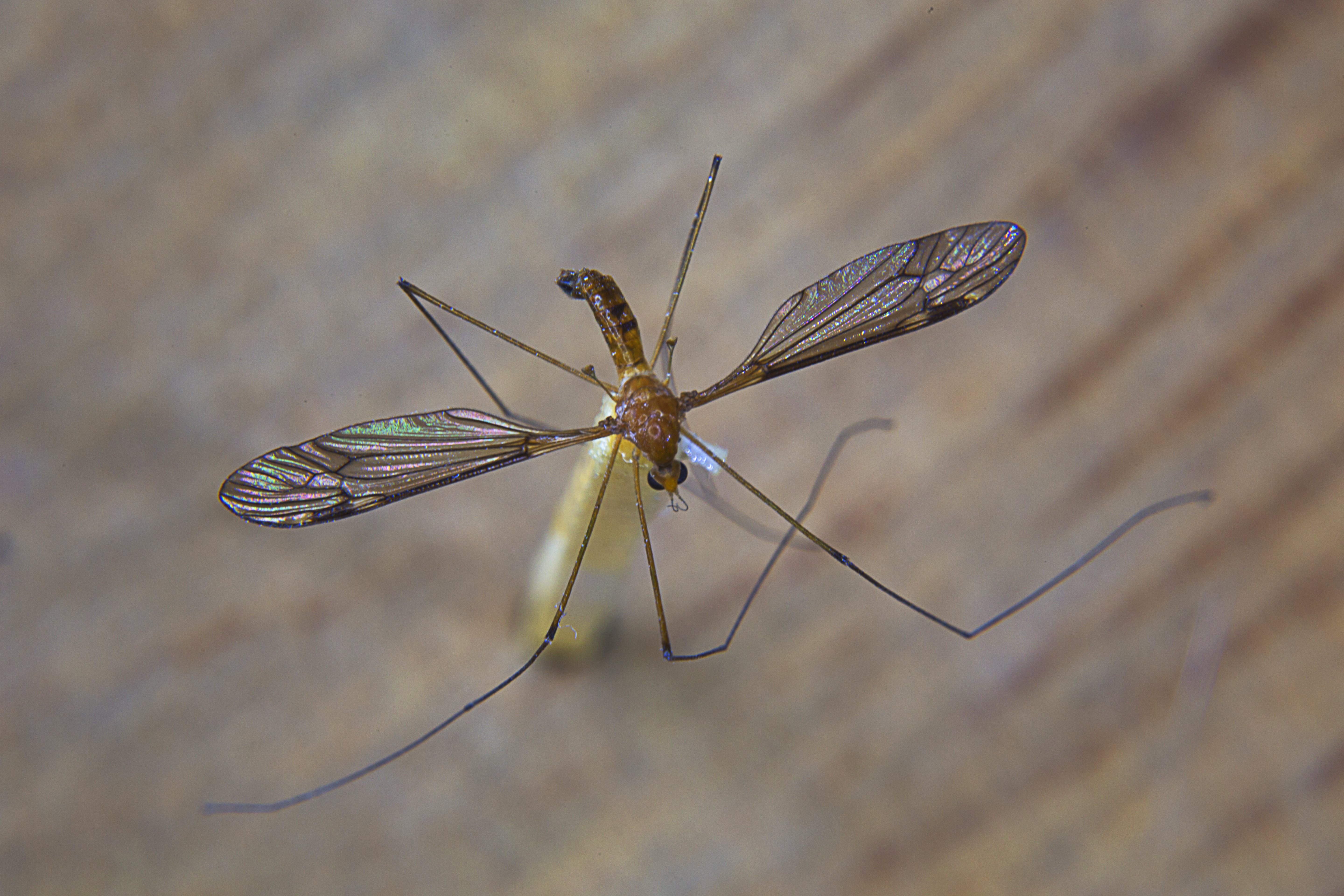 An interesting characteristic of Crane Flies is that they have only one pair of wings. The second pair of wings has evolved in distinctive halteres, small knobbed structures that help maintain stability in flight.