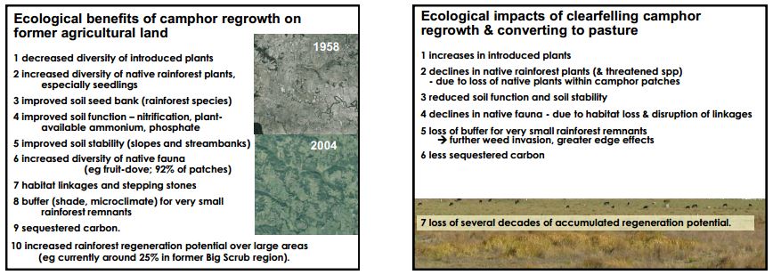 The Camphor case study of the “Big Scrub” in northern NSW, originally a 750sq km rainforest (c. 1800), shows that in 1958 less than 0.1% remained uncleared. In 2004, 25% of the area was forest regrowth dominated by Camphor Laurel, introduced from China.