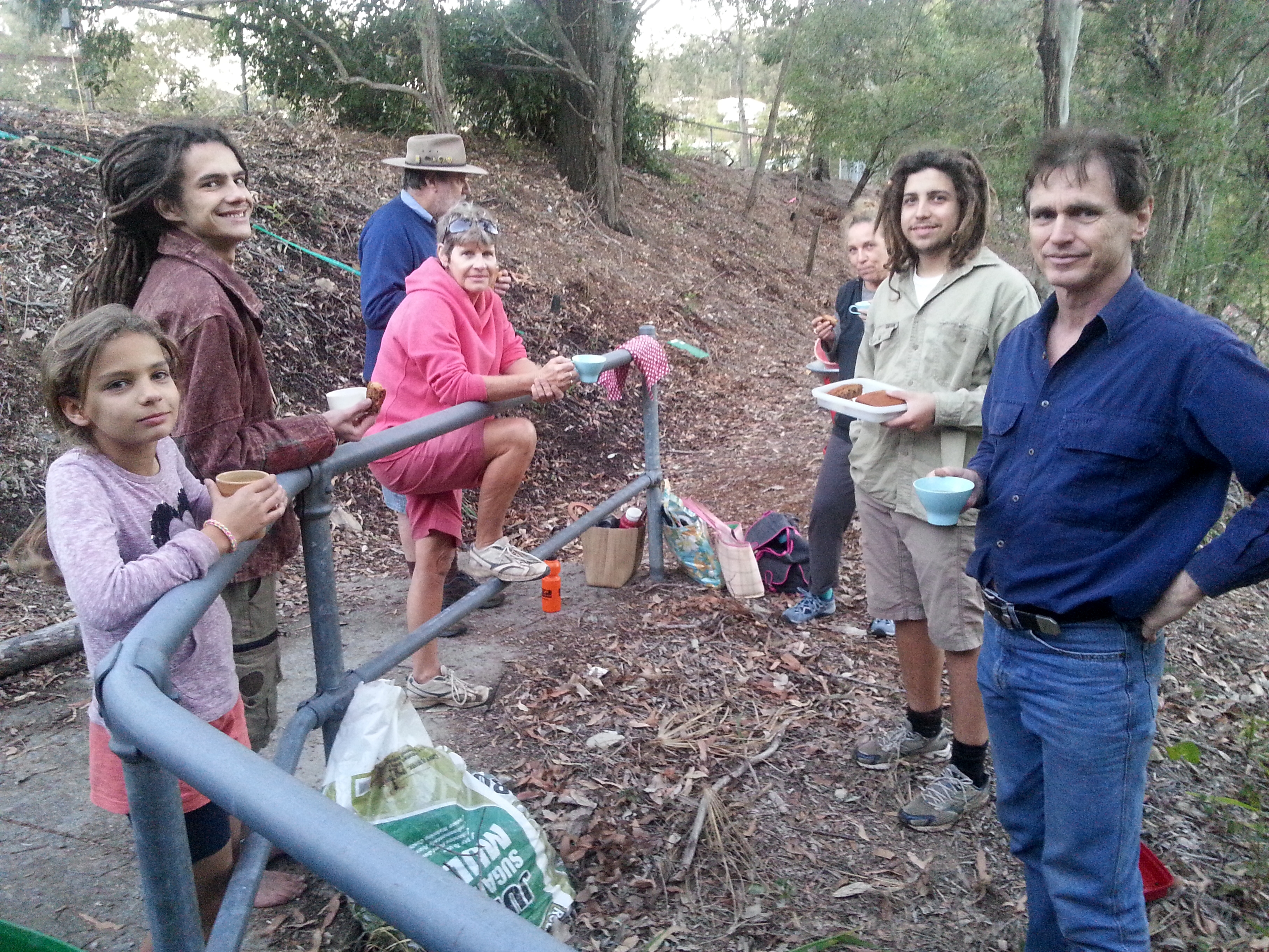 Eating Sheamus’s fresh baked cake was nearly as good as planting six each of the Wombat Berry Eustrephus latifolius, Native Sarsaparilla Hardenbergia violacea, Scrambling Lily Geitonoplesium cymosum, Black She-oak Allocasuarina littoralis, Grey Gums Eucalyptus bitturbinata, Acacias and Brush Box Lophostemon confertus. But much better than weeding and shoveling mulch. All washed down with steaming hot cups peppermint and black tea to warm the hands at the end of a very productive day.