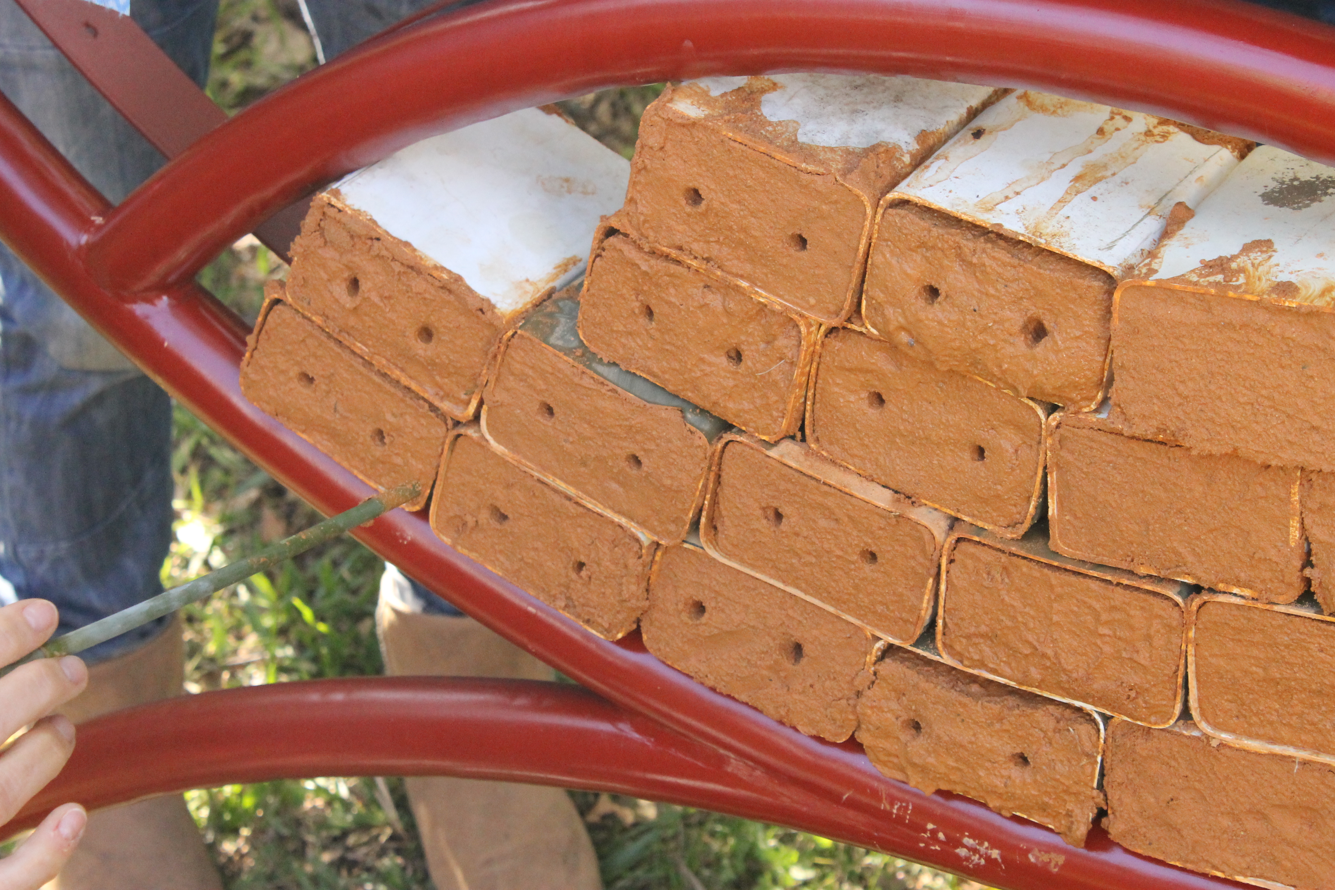 Most people use a 20cm rectangular down-pipe to create mud bricks with starter holes for the bees to nest in. The image below is of a ready made brick composed of 3 parts sand to 1 part natural clay.