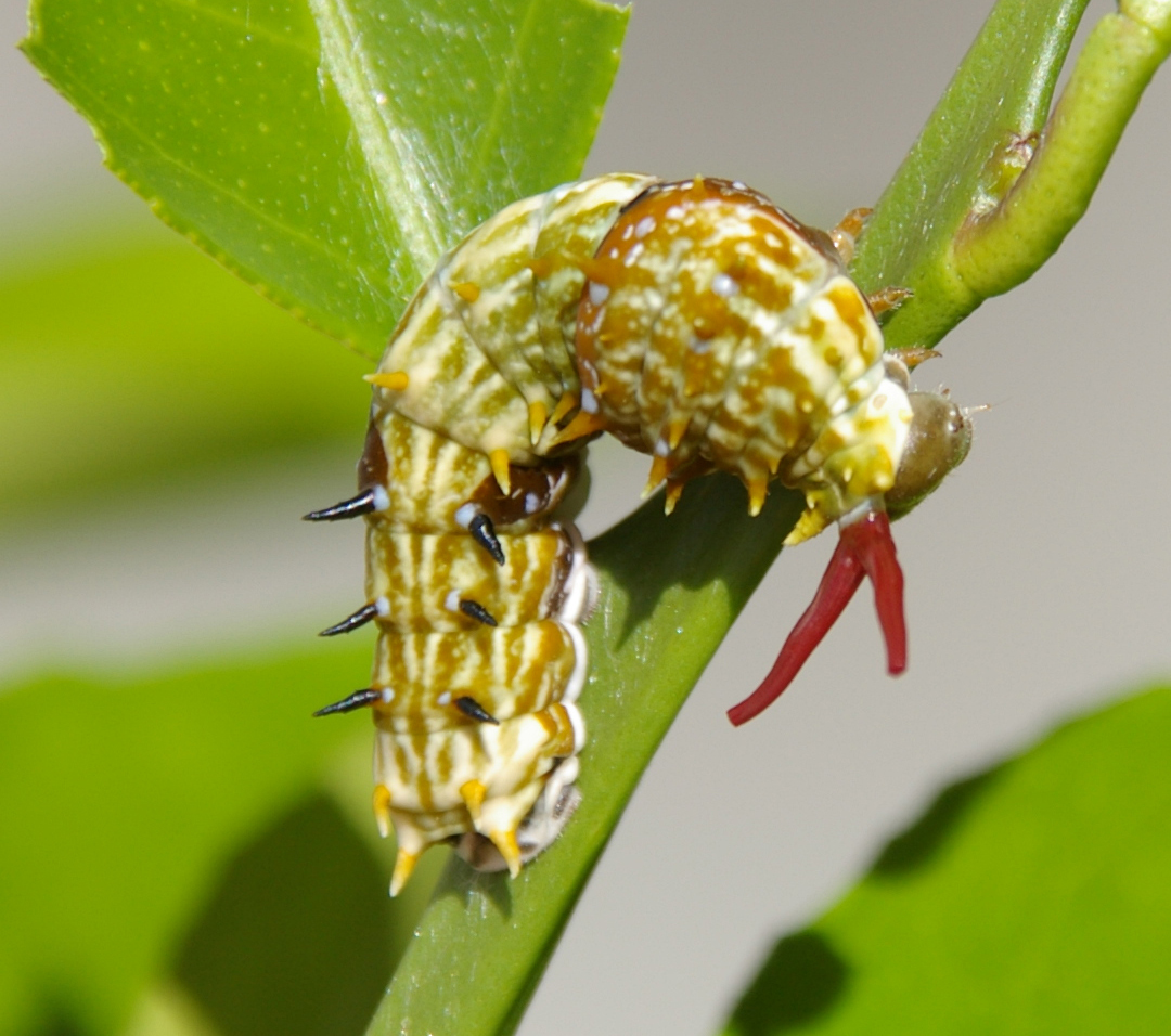 The caterpillars will grow to about 60mm and change to a greenish colour before they from a chrysalis. When disturbed Orchard Swallowtail caterpillars extend bright red osmeterium to frighten off attackers.
