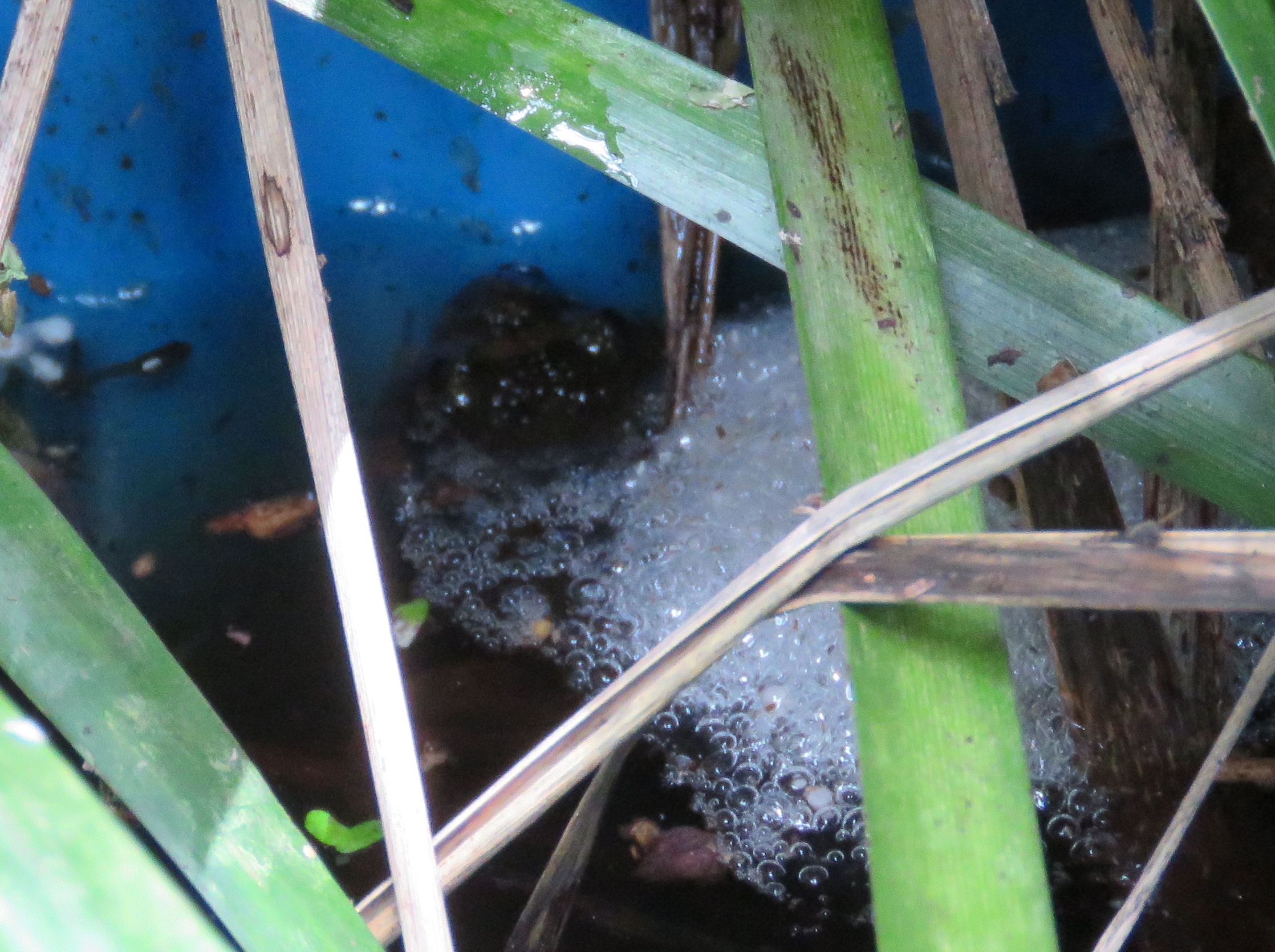 Evidence of success is a raft of frog eggs and a Tusked Frog Adelotus brevis hiding among the leaves.