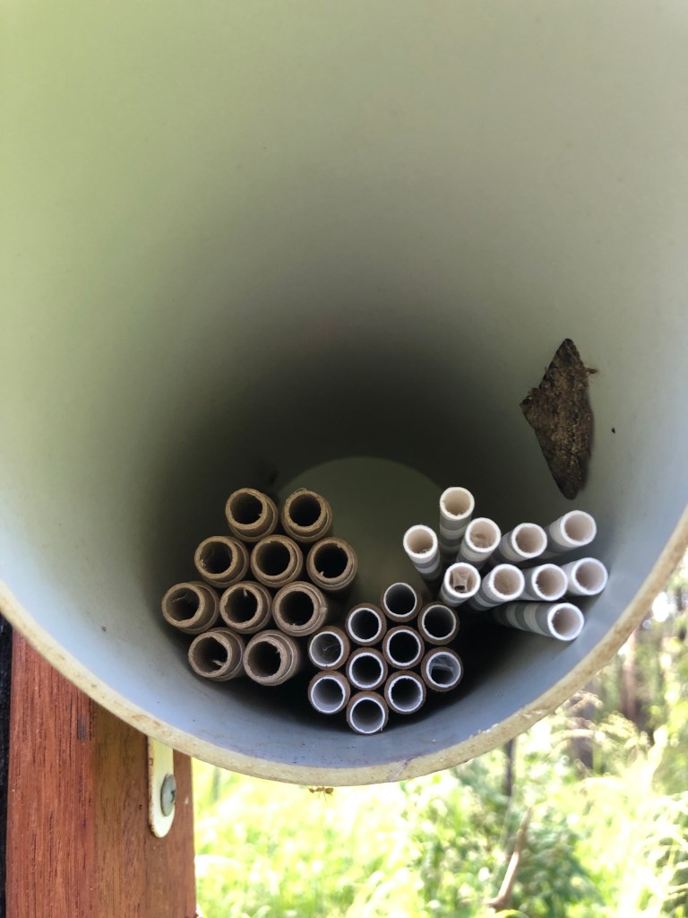 The target species for the Bee Homes are “Borders” like Leaf-cutter and Resin Bees which find a suitable hollow to make a nest. For the trial we used a mix of tubes from UK Mason Bees (7mm), Crown Bees USA (7mm) and simple paper straws (6mm) from BigW.