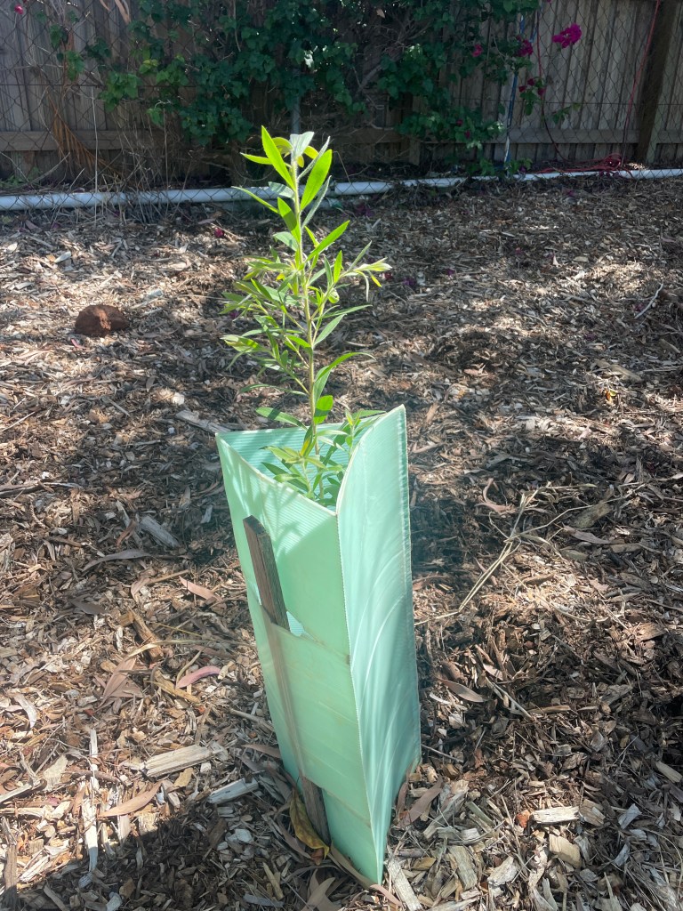 Swamp Paperbarks Melaleuca quinquenervia have been planted near an area that gets boggy to help soak up the excess water. Two months on and the Melaleucas are now higher than the plant shelters. My experience is that tube stock will out perform larger more expensive plants.