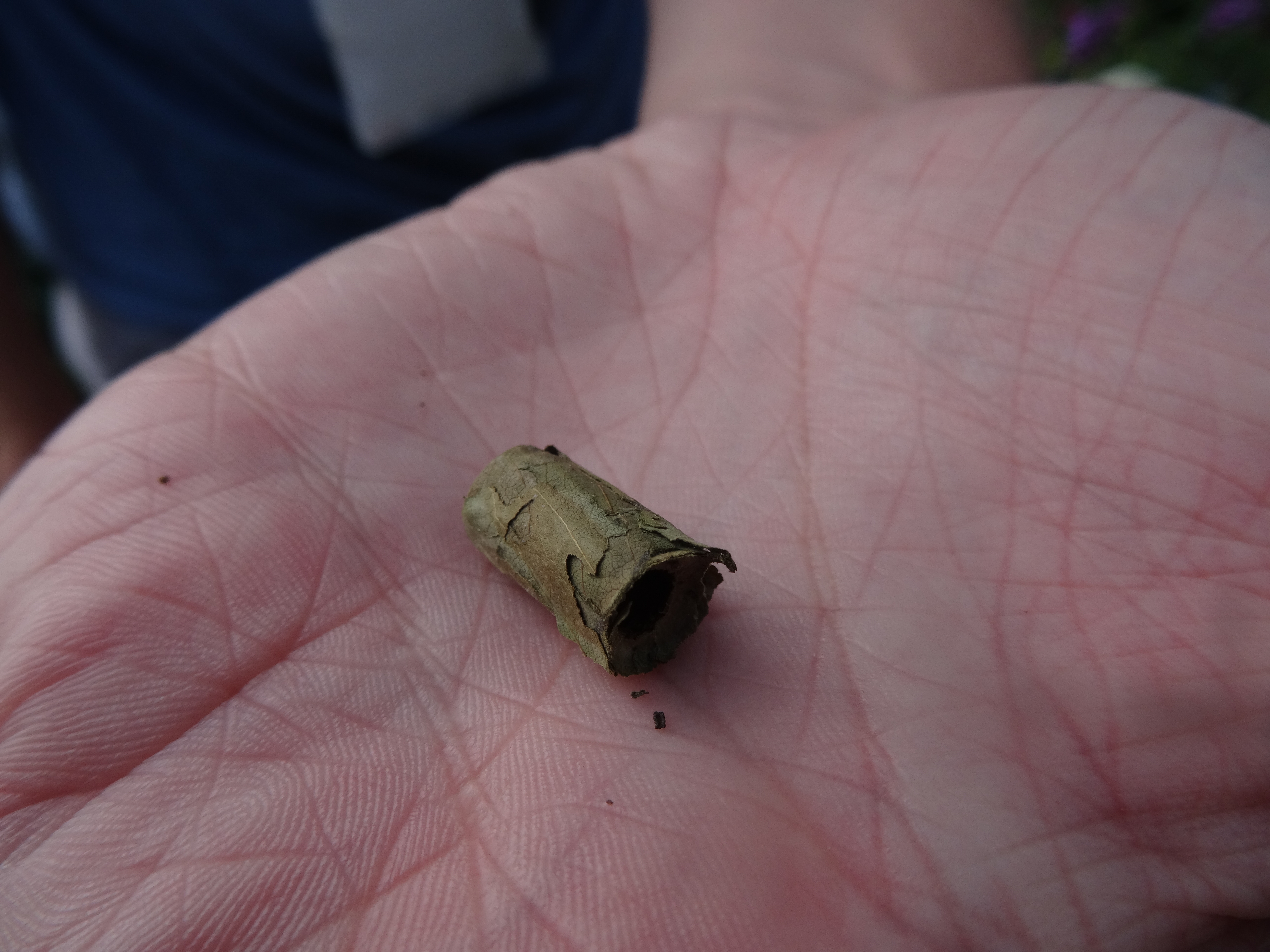 Leaf-cutter bee nests are made by rolling sections of leaves cut from plants like roses or ginger. The cigar shaped nest is filled and sealed.
