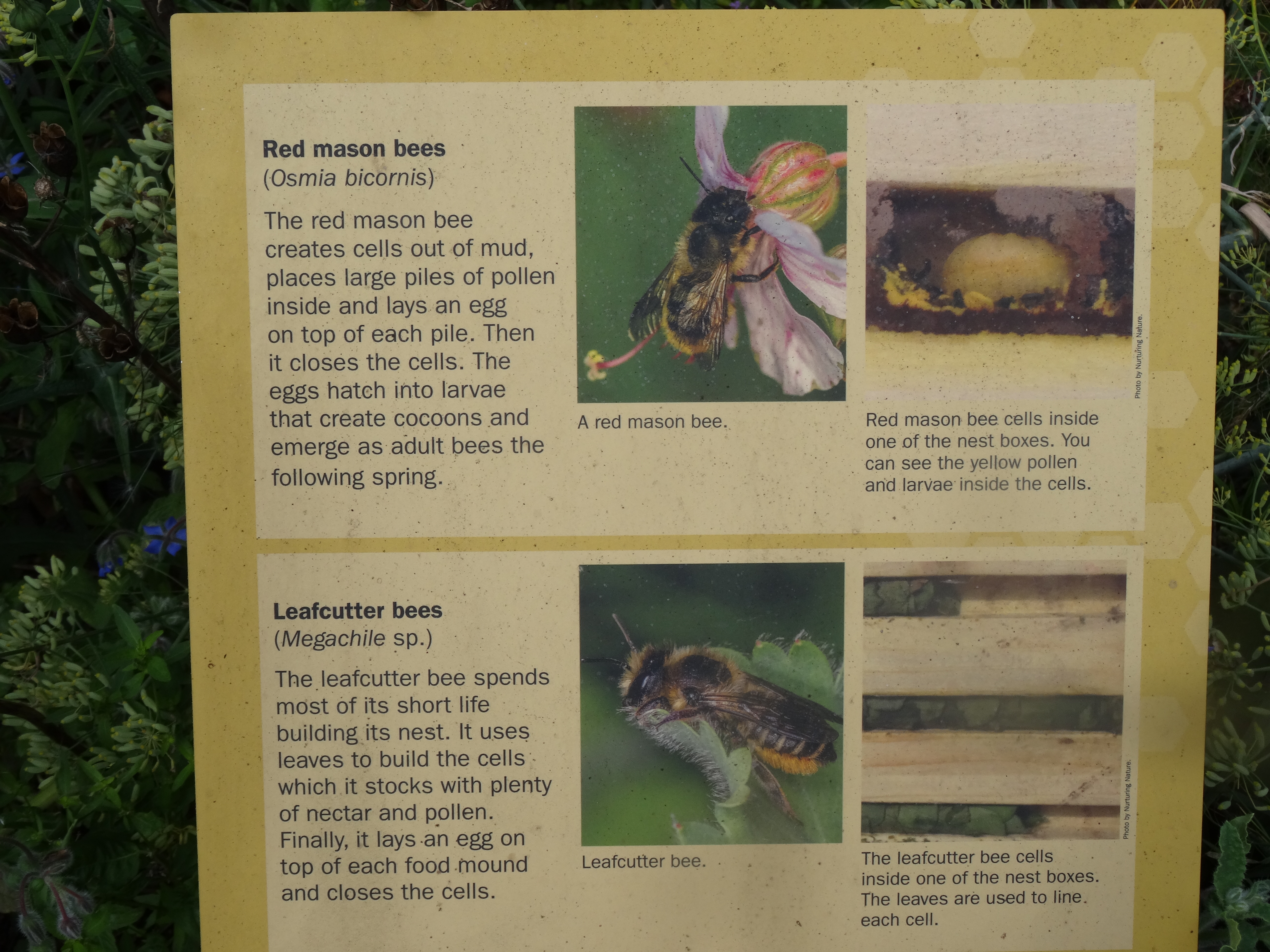 The female bee prepares a nest then fills it with nectar and pollen before an egg is laid and nest is sealed. Another nest is then prepared.