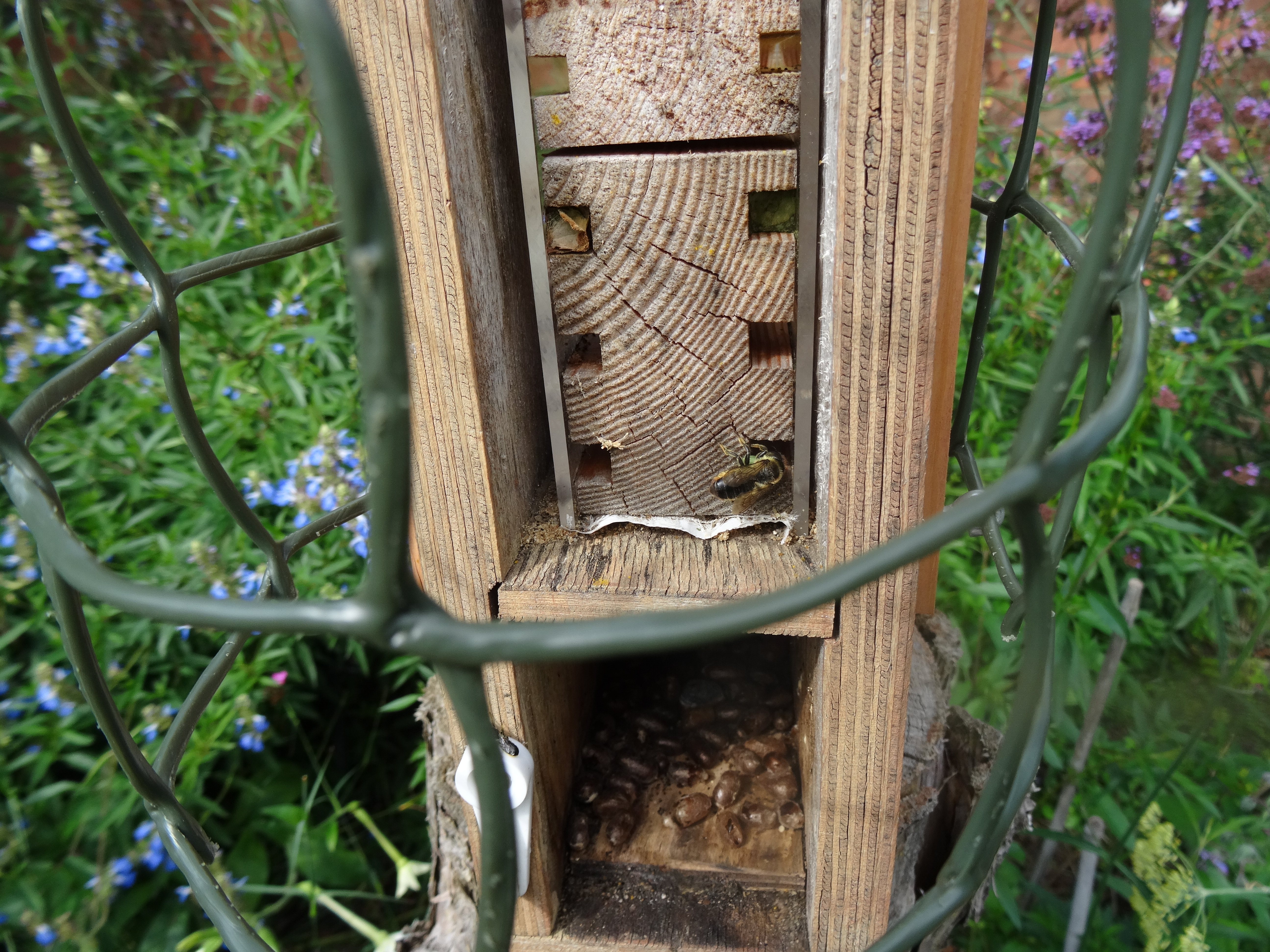 Removing the panel from the side allows the nesting activity to be monitored. Top orange rows are resin bee nests and the lower green rows are leaf-cutter bee nests.